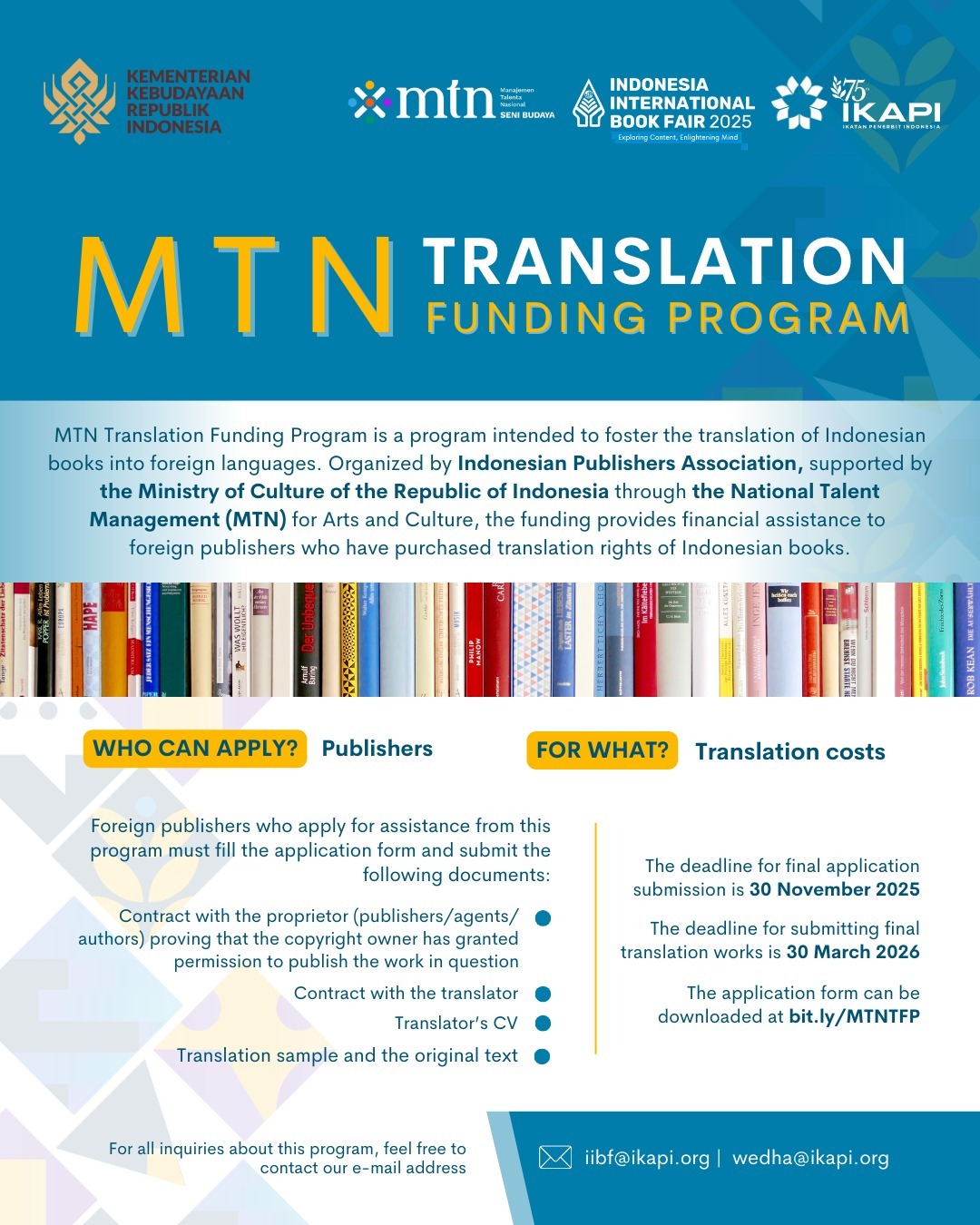 MTN Translation Funding Program 2025 -Indonesia The MTN Translation Funding Program is open to publishers across all literary genres, who are interested in translating and publishing Indonesian books into his/her language and territory. The maximum grant will be IDR33,000,000 for fiction and nonfiction books, and maximum IDR11,000,000 for children's book. Deadline: Applications must be submitted by 1 November 2025. Selections will be made after this date, and all applicants will be notified of the results. For more information: Wedha wedha@ikapi.org Thomas Nung Atasana nung.atasana@ikapi.org * For Indonesian right acquisition: contact us at Pol International Agency